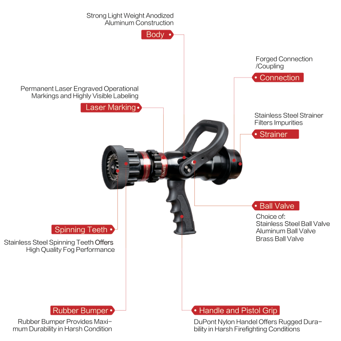 The Adjustable Flow Rate Nozzle (950LPM) is a high-performance, large-flow firefighting tool, essential for city fire and petroleum/petrochemical plant fire scenarios, capable of producing quality foam and multiple water jet patterns.