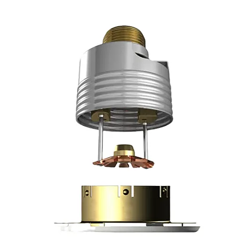 The nozzle body is entirely concealed above the ceiling, leaving only the edge of the sleeve level with the ceiling surface. A decorative cover plate is positioned at the sleeve's opening, harmonizing in color and texture with the ceiling to ensure total visual integration. As with all wet fire protection systems, the pipes that connect the sprinkler bodies are perpetually filled with pressurized water, standing ready to respond at a moment's notice.
